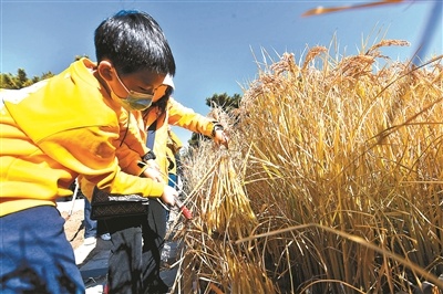 昨天上午,北京青年報記者來到先農(nóng)壇,觀耕臺前的一畝三分地上,水稻已經(jīng)成熟,稻穗在陽光下隨風(fēng)搖曳,煥發(fā)出金燦燦的光澤,構(gòu)成獨(dú)特的古都秋景。隨著主持人開鑼、小朋友們齊喊“豐收嘍”,收割儀式正式開始。在場嘉賓和10名小朋友一起收割第一鐮新稻子,寓意豐收碩果新開始。