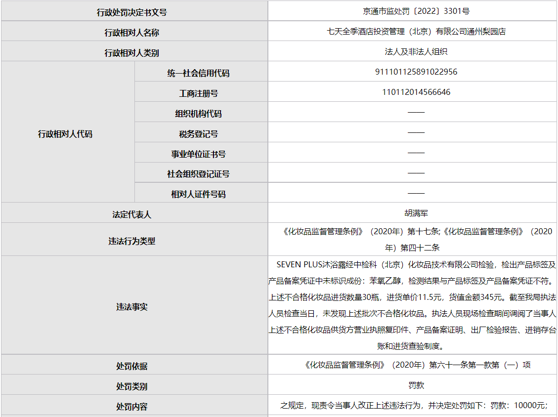 據(jù)文號為“京通市監(jiān)處罰〔2022〕3301號”行政處罰決定書顯示,七天酒店梨園店具體違法事實為:SEVEN PLUS沐浴露經(jīng)中檢科(北京)化妝品技術(shù)有限公司檢驗,檢出產(chǎn)品標簽及產(chǎn)品備案憑證中未標識成份:苯氧乙醇,檢測結(jié)果與產(chǎn)品標簽及產(chǎn)品備案憑證不符。上述不合格化妝品進貨數(shù)量30瓶,進貨單價11.5元,貨值金額345元。