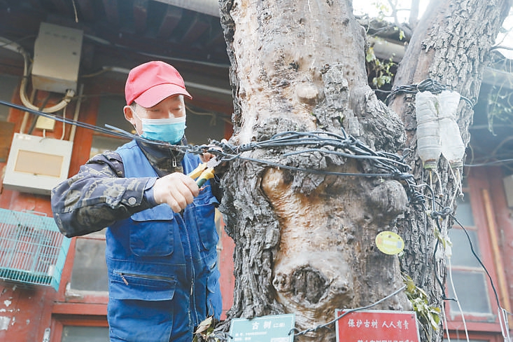 日前,在園林綠化部門、社區(qū)居委會(huì)工作人員的陪同下,東四街道綜合行政執(zhí)法隊(duì)來到東四六條某平房院。在院落南側(cè)房屋過道處,一棵樹齡約110年、掛著二級(jí)保護(hù)標(biāo)牌的棗樹特別扎眼。古樹虬曲蒼勁,樹皮斑駁,在樹杈處,數(shù)根電線、鐵絲緊緊纏繞著樹干,由于年代久遠(yuǎn),部分鐵絲已深深嵌進(jìn)了樹皮。居民利用古樹掛衣服、掛盆栽,還在樹身上釘了釘子。古樹根部周圍地面覆蓋了一層厚厚的水泥和瀝青,堆放著廢舊紙箱和花盆等雜物。工作人員立即找來工具,將樹身上的電線、鐵絲、釘子一一清除,清理了堆放在樹根處的雜物,并對(duì)樹根部的土壤進(jìn)行疏松,使古樹得以“脫困”。