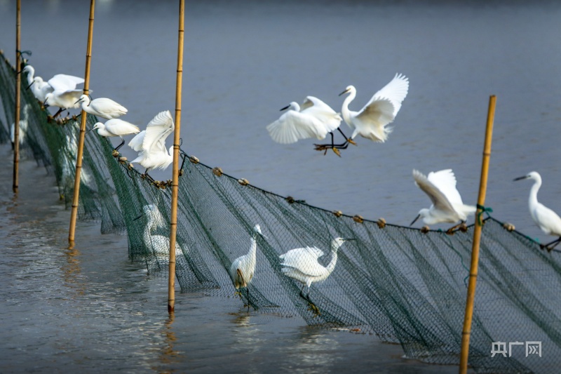 央廣網(wǎng)都昌12月13日消息(記者鄧玉玲)時(shí)值冬日,在江西鄱陽湖都昌磯山湖濕地,仍然活躍著近千只夏候鳥白鷺,它們追逐在湖畔淺灘,守候在隔離網(wǎng)周邊,捕食著可口的小魚小蝦,享受著候鳥家園的歡樂。