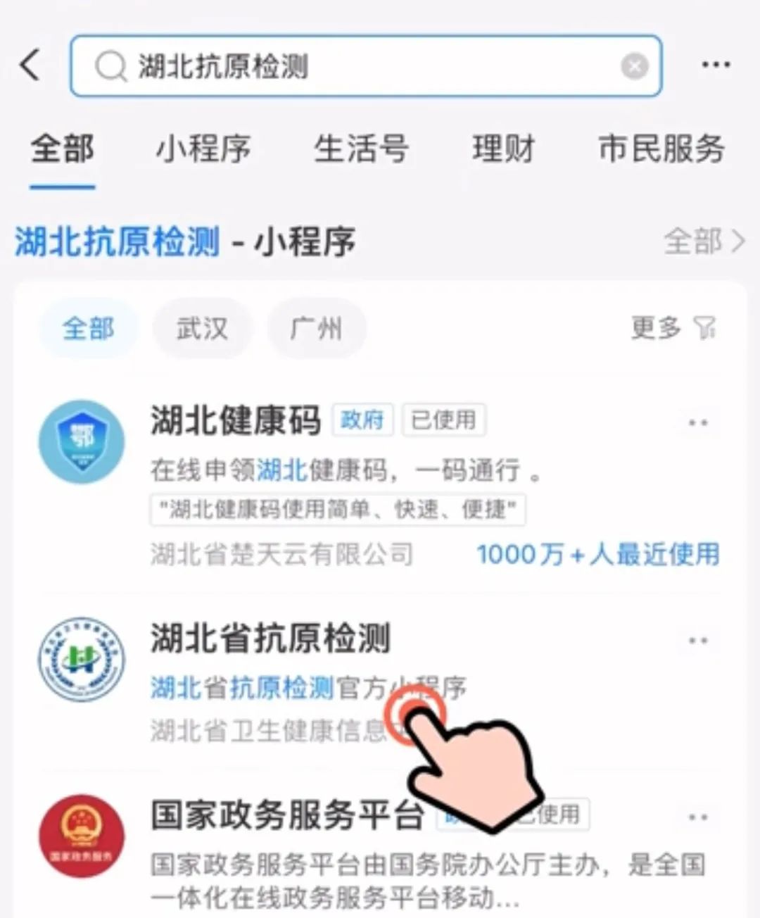 1.首先打開支付寶,搜索“湖北抗原檢測”,點擊“湖北省抗原檢測官方小程序”,進入“個人檢測上報”。