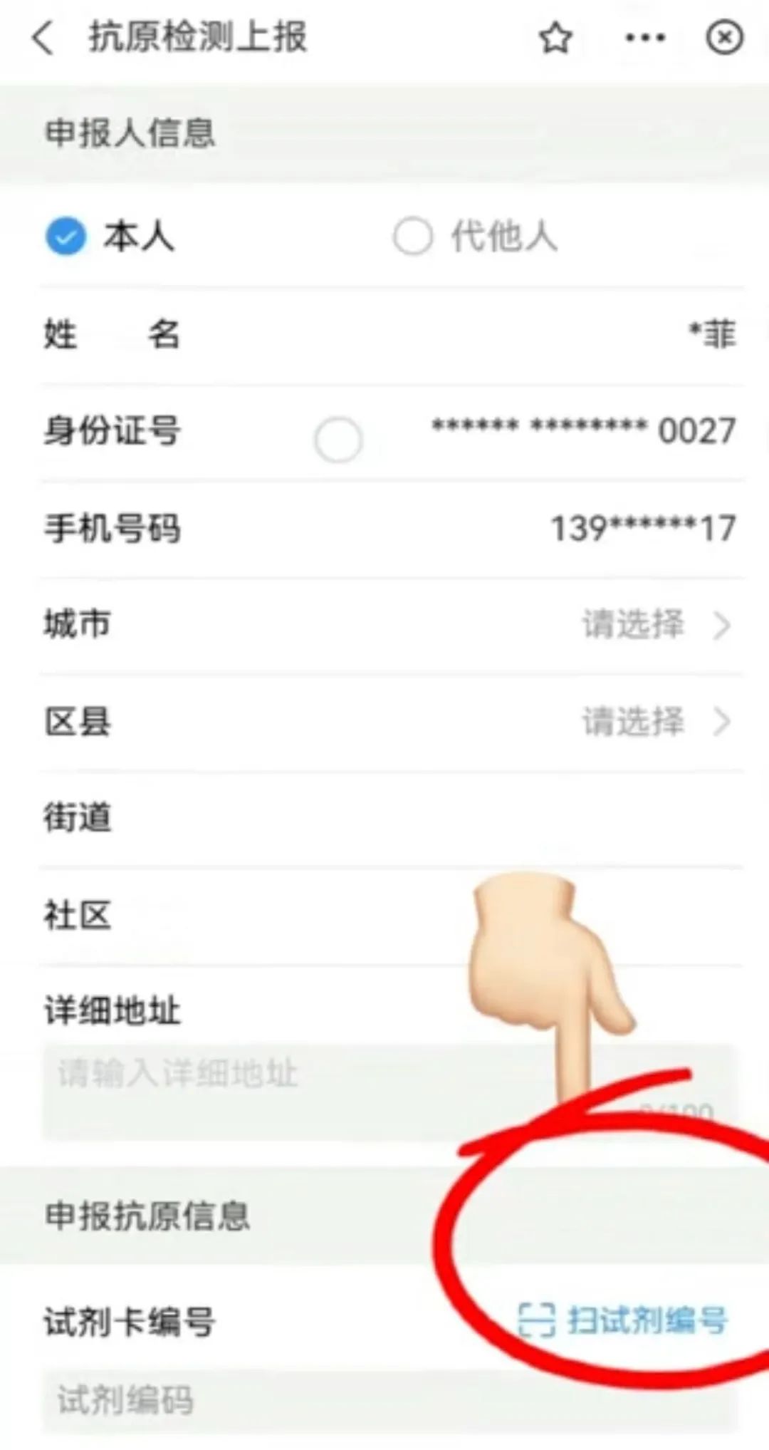 2.自動生成申報人信息,選擇所在城市、區(qū)縣、街道、社區(qū),填寫詳細地址。
