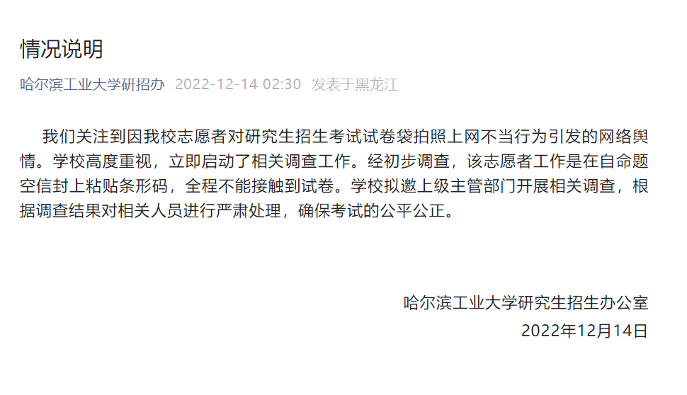 央廣網(wǎng)哈爾濱12月14日消息(記者馬俊瑋)12月14日,哈爾濱工業(yè)大學研究生招生辦公室通報:我們關注到因我校志愿者對研究生招生考試試卷袋拍照上網(wǎng)不當行為引發(fā)的網(wǎng)絡輿情。學校高度重視,立即啟動了相關調查工作。經(jīng)初步調查,該志愿者工作是在自命題空信封上粘貼條形碼,全程不能接觸到試卷。學校擬邀上級主管部門開展相關調查,根據(jù)調查結果對相關人員進行嚴肅處理,確??荚嚨墓焦?/p>
