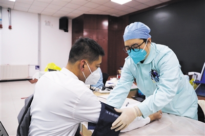 12月22日,朝陽區(qū)左家莊街道辦事處,醫(yī)護工作者為獻血者測量血壓。新京報記者 王飛 攝