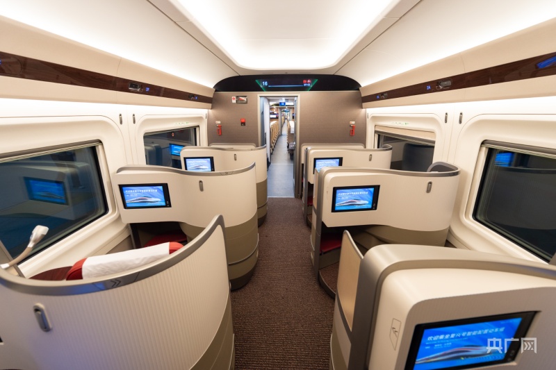 商務座采用以“太極”為主題的魚骨式布局,每個席位配置的車載電視改為外置后,可進行手機投屏觀影、自主查詢列車運行位置、服務介紹、娛樂資源、天氣查詢等服務。旅客們在12306客戶端購票時將看到“智能動車”字樣的車次,選擇購買即可。