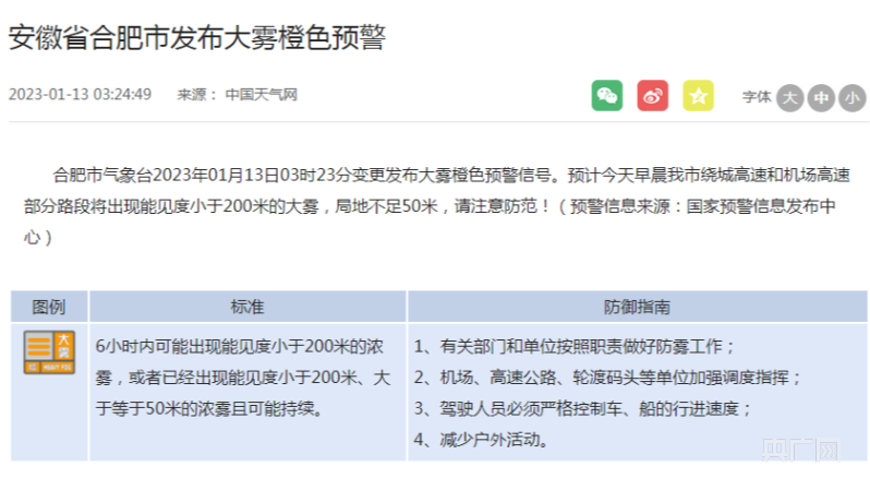 央廣網(wǎng)合肥1月13日消息(記者鮑玉嬋)記者從安徽省氣象局獲悉,合肥市氣象臺(tái)2023年01月13日03時(shí)23分變更發(fā)布大霧橙色預(yù)警信號(hào)。預(yù)計(jì)今天早晨我市繞城高速和機(jī)場(chǎng)高速部分路段將出現(xiàn)能見(jiàn)度小于200米的大霧,局地不足50米,請(qǐng)注意防范!