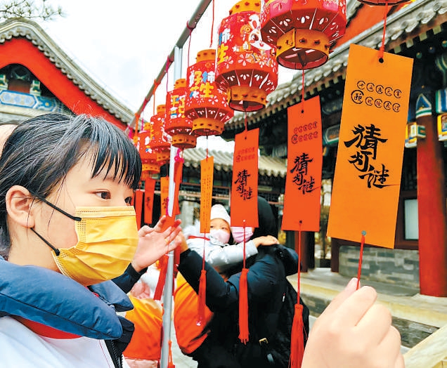 玉淵潭公園昨天(5日)開展了“正月十五花燈俏 科普猜謎送福瑞”傳統(tǒng)文化主題活動。活動現(xiàn)場,燈謎與燈籠競相爭輝,一只只小燈籠高高掛起,一條條五彩斑斕的燈謎似條條彩帶隨風飄揚。謎面內(nèi)容豐富有趣,現(xiàn)場參與猜燈謎環(huán)節(jié)的游客朋友們或仰頭讀題,或低頭沉思,你一言我一語,一個個有趣的謎底在大家的思索中紛紛揭曉。