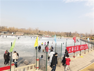 在奧林匹克公園龍形水系旁,記者遇到一對(duì)父子,他們想要推開圍擋靠近冰面,被附近的安保人員勸返。這位安保人員告訴記者,去年農(nóng)歷臘月二十八,有人在冰面上玩耍時(shí)落水,此后,相關(guān)管理人員在冰面的所有入口處設(shè)置了圍擋,并安排安保人員每日7點(diǎn)到18點(diǎn)值守,及時(shí)勸阻游玩者。