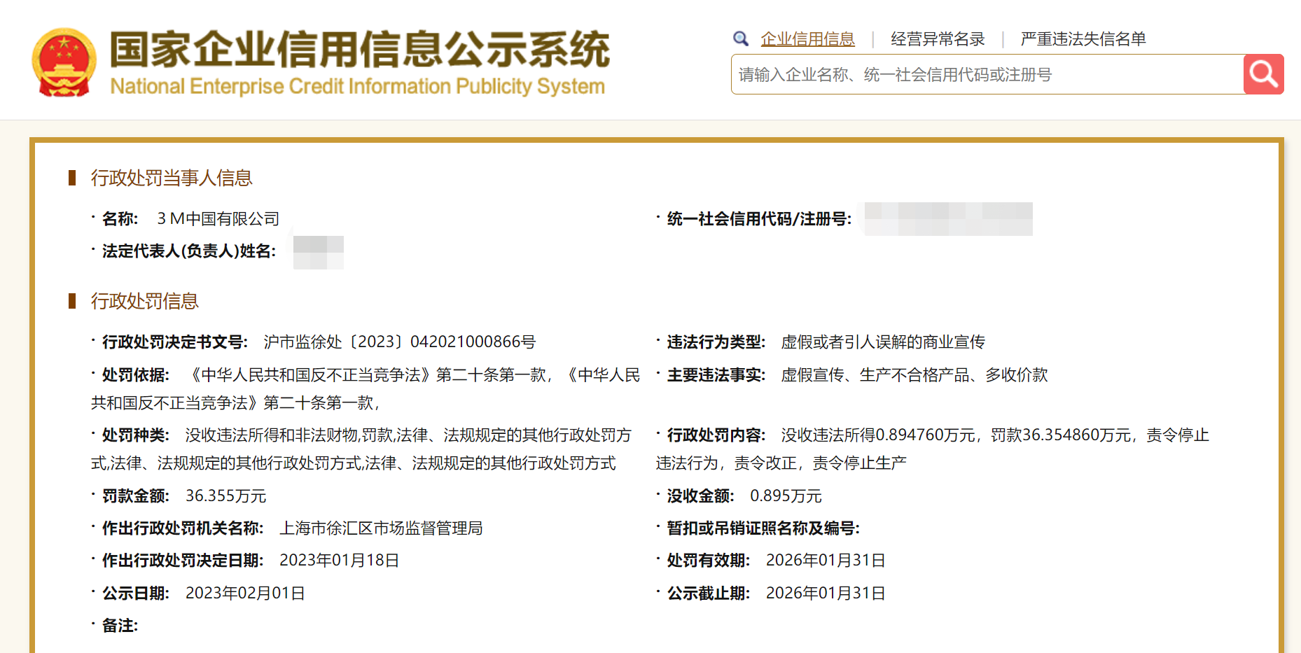 央廣網北京2月20日消息 據國家企業(yè)信用信息公示系統(tǒng)網站消息,近日,3M中國有限公司因虛假宣傳等被上海市徐匯區(qū)市場監(jiān)督管理局罰款36萬余元。