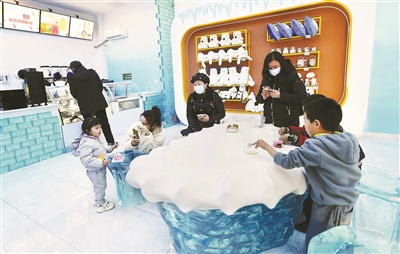 北極熊文創(chuàng)商店在原有經(jīng)營(yíng)網(wǎng)點(diǎn)的基礎(chǔ)上升級(jí),為游客參觀游覽提供更多樂(lè)趣。商店門(mén)頭門(mén)口擺放北極熊雕塑及雪山造型,游客們還未進(jìn)店就可以感受冰雪世界的魅力。店內(nèi)按照功能劃分為5大區(qū)域,包括餐飲售賣(mài)區(qū)、觀景休閑區(qū)、觀摩體驗(yàn)區(qū)、拍照打卡區(qū)和周邊商品展示區(qū)。