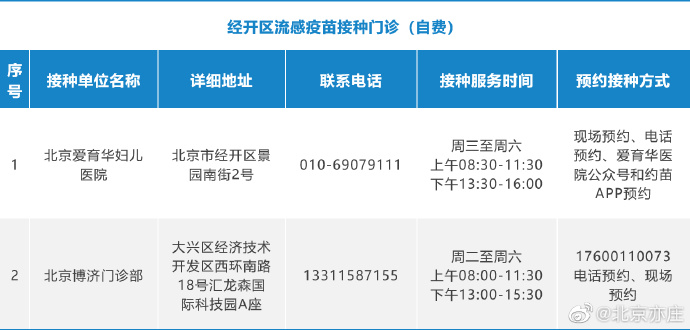 社會(huì)事業(yè)局相關(guān)負(fù)責(zé)人介紹,經(jīng)開(kāi)區(qū)將繼續(xù)采用提前預(yù)約方式開(kāi)展自費(fèi)流感疫苗接種工作。目前,經(jīng)開(kāi)區(qū)共設(shè)立北京博濟(jì)門診部、北京愛(ài)育華婦兒醫(yī)院兩個(gè)流感疫苗接種服務(wù)點(diǎn),有接種需求的市民可提前向接種門診預(yù)約咨詢,可通過(guò)電話、現(xiàn)場(chǎng)登記、微信公眾號(hào)及其他網(wǎng)絡(luò)預(yù)約方式完成預(yù)約。