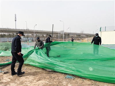 3月22日,石景山古城街道綜合行政執(zhí)法人員來到轄區(qū)內(nèi)工地,要求施工單位對(duì)裸露地面、渣土堆放場(chǎng)所及時(shí)苫蓋,施工期間進(jìn)行灑水降塵,渣土運(yùn)輸車輛確保清潔到位上路不遺撒,從源頭杜絕揚(yáng)塵污染源的發(fā)生。新京報(bào)記者 浦峰 通訊員 王亞楠 攝