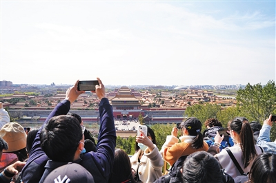 3月26日,景山公園,游客眺望遠(yuǎn)處故宮拍照打卡。新京報(bào)記者 王飛 攝