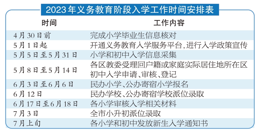 4月30日前,本市將完成小學畢業(yè)生信息核對;5月1日起,義務(wù)教育入學服務(wù)平臺開通,進行入學政策宣傳;5月5日至5月31日,進行小學和初中入學信息采集。