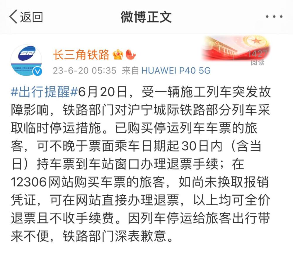 記者6月20日從鐵路上海局獲悉,受一輛施工列車突發(fā)故障影響,鐵路部門對(duì)滬寧城際鐵路部分列車采取臨時(shí)停運(yùn)措施。已購買停運(yùn)列車車票的旅客,可不晚于票面乘車日期起30日內(nèi)(含當(dāng)日)持車票到車站窗口辦理退票手續(xù);在12306網(wǎng)站購買車票的旅客,如尚未換取報(bào)銷憑證,可在網(wǎng)站直接辦理退票,以上均可全價(jià)退票且不收手續(xù)費(fèi)。