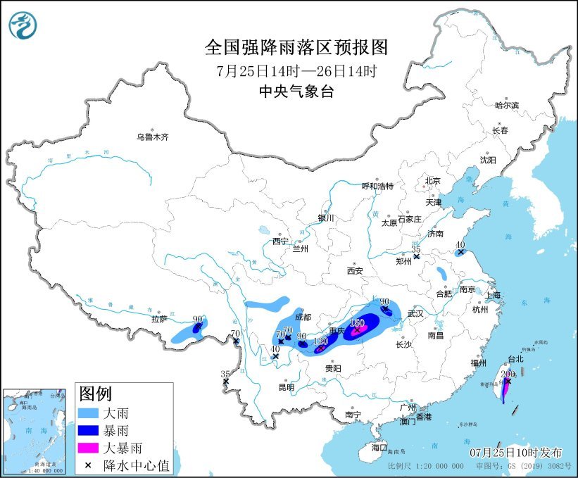 預(yù)計(jì),7月25日14時(shí)至26日14時(shí),西藏東南部、云南西部和東北部、四川西部和南部、貴州北部、重慶東部、湖北西南部、湖南西北部以及臺(tái)灣島東部等地有大到暴雨,其中,貴州西北部、重慶東南部、湖南西北部和臺(tái)灣島東部等地的部分地區(qū)有大暴雨(100~200毫米);上述部分地區(qū)伴有短時(shí)強(qiáng)降水(最大小時(shí)降雨量20~50毫米,局地可超過(guò)80毫米),局地有雷暴大風(fēng)等強(qiáng)對(duì)流天氣。