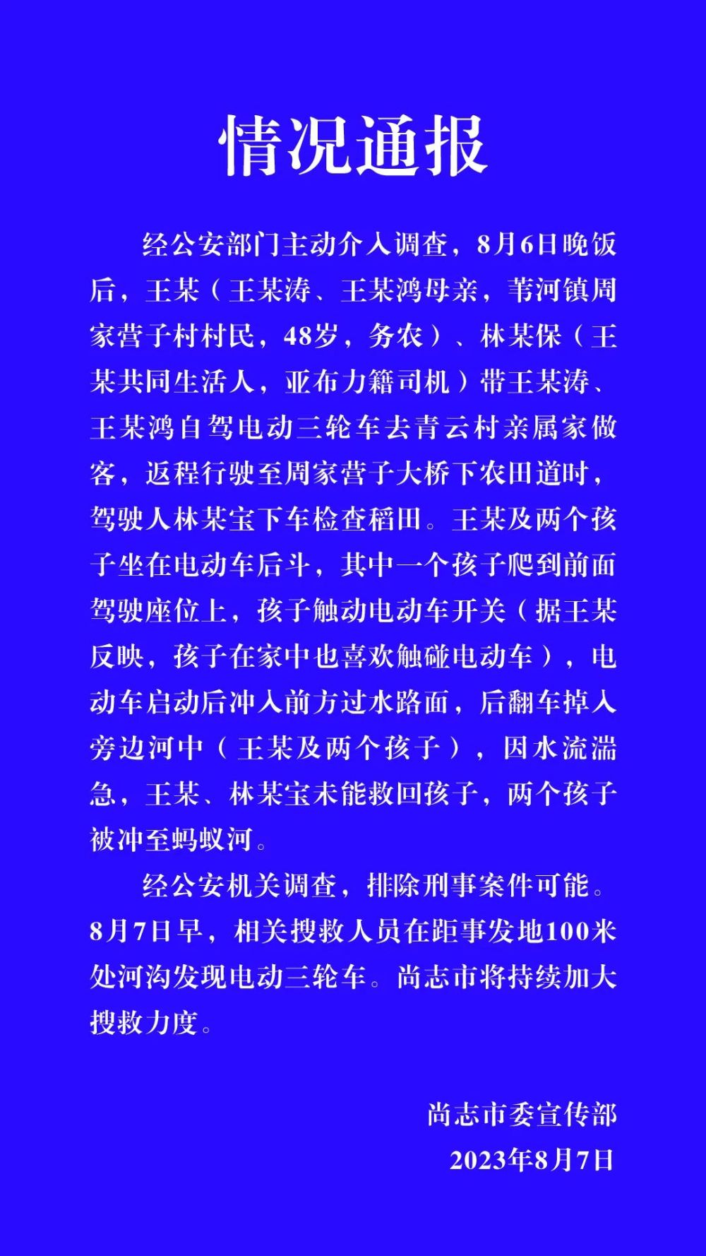 中新網(wǎng)8月8日電 據(jù)尚志市委宣傳部微信公眾號(hào)消息,經(jīng)公安部門(mén)主動(dòng)介入調(diào)查,8月6日晚飯后,王某(王某濤、王某鴻母親,葦河鎮(zhèn)周家營(yíng)子村村民,48歲,務(wù)農(nóng))、林某保(王某共同生活人,亞布力籍司機(jī))帶王某濤、王某鴻自駕電動(dòng)三輪車去青云村親屬家做客,返程行駛至周家營(yíng)子大橋下農(nóng)田道時(shí),駕駛?cè)肆帜硨毾萝嚈z查稻田。王某及兩個(gè)孩子坐在電動(dòng)車后斗,其中一個(gè)孩子爬到前面駕駛座位上,孩子觸動(dòng)電動(dòng)車開(kāi)關(guān)(據(jù)王某反映,孩子在家中也喜歡觸碰電動(dòng)車),電動(dòng)車啟動(dòng)后沖入前方過(guò)水路面,后翻車掉入旁邊河中(王某及兩個(gè)孩子),因水流湍急,王某、林某寶未能救回孩子,兩個(gè)孩子被沖至螞蟻河。