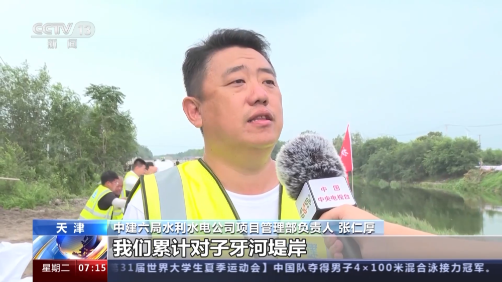 中建六局水利水電公司項目管理部負責人 張仁厚:我們累計對子牙河堤岸進行7.9公里的加高加固。接到緊急施工任務以后,我們迅速抽調人員、設備,將子牙河左岸堤壩由7米加高到8米,此項工作一到兩天內施工完成。