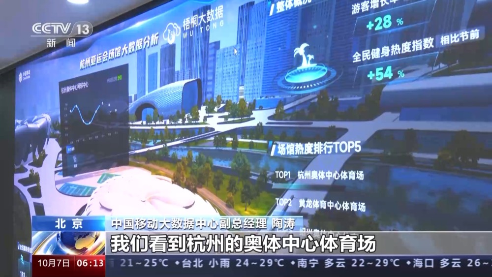 中國移動大數(shù)據(jù)中心副總經(jīng)理 陶濤:前往亞運會主要舉辦城市的游客的數(shù)量相比節(jié)前一周日均增幅超過28%,主要是來自長三角地區(qū)以及津京冀等地區(qū)。根據(jù)我們對于線上訂票以及搜索這些數(shù)據(jù)的分析,我們看到杭州的奧體中心體育場、黃龍體育中心體育場以及紹興奧體中心體育館這三個場館是最熱的體育場館。