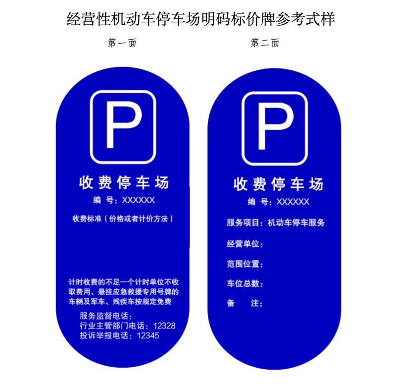 根據(jù)相關(guān)法規(guī)政策的新要求,按照依法合規(guī)、便民利民、不做大改的原則,征求意見稿對(duì)兩種機(jī)動(dòng)車停車場(chǎng)明碼標(biāo)價(jià)牌參考式樣進(jìn)行了修改完善,并附上“經(jīng)營(yíng)性機(jī)動(dòng)車停車場(chǎng)明碼標(biāo)價(jià)牌參考式樣”和“道路電子收費(fèi)停車場(chǎng)明碼標(biāo)價(jià)牌參考式樣”,供相關(guān)單位參照自行制作明碼標(biāo)價(jià)牌,明碼標(biāo)價(jià)牌編號(hào)為北京市公共停車場(chǎng)經(jīng)營(yíng)備案證的備案號(hào)。