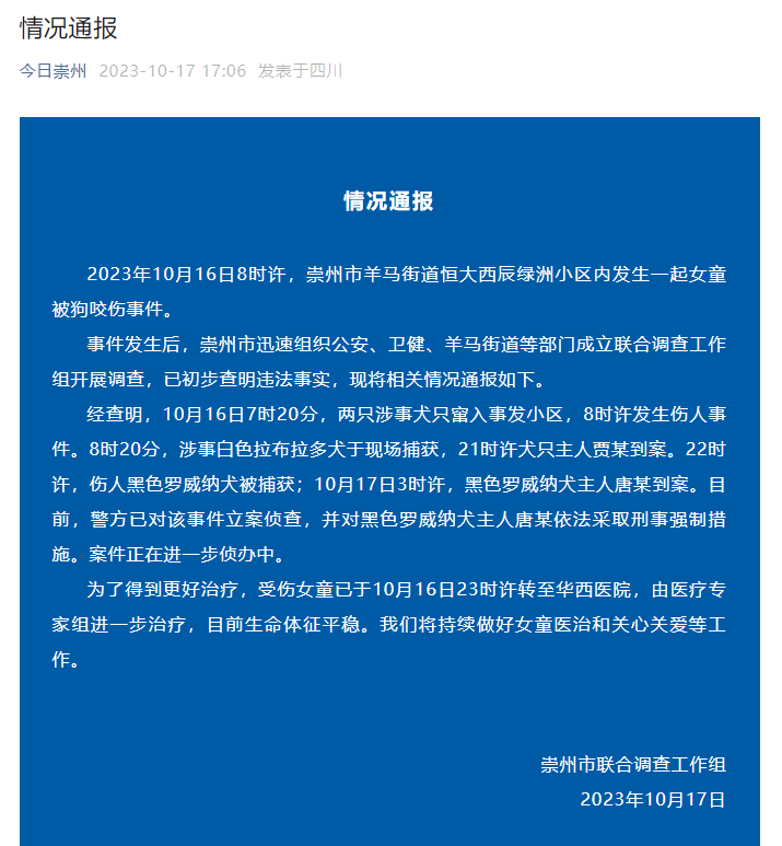 剛剛,“今日崇州”微信公號發(fā)布通報:16日8時20分,涉事白色拉布拉多犬于現(xiàn)場捕獲,21時許犬只主人賈某到案。22時許,傷人黑色羅威納犬被捕獲;10月17日3時許,黑色羅威納犬主人唐某到案。目前,警方已對該事件立案偵查,并對黑色羅威納犬主人唐某依法采取刑事強制措施。案件正在進(jìn)一步偵辦中。
