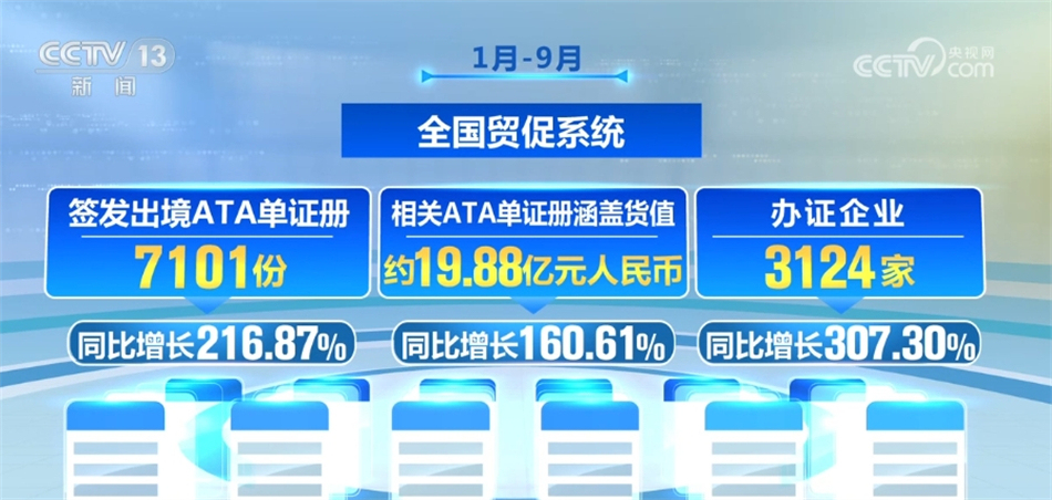 1月—9月,全國(guó)貿(mào)促系統(tǒng)共簽發(fā)出境ATA單證冊(cè)7101份,同比增長(zhǎng)216.87%;相關(guān)ATA單證冊(cè)涵蓋貨值約19.88億元人民幣,同比增長(zhǎng)160.61%;辦證企業(yè)3124家,同比增長(zhǎng)307.30%。