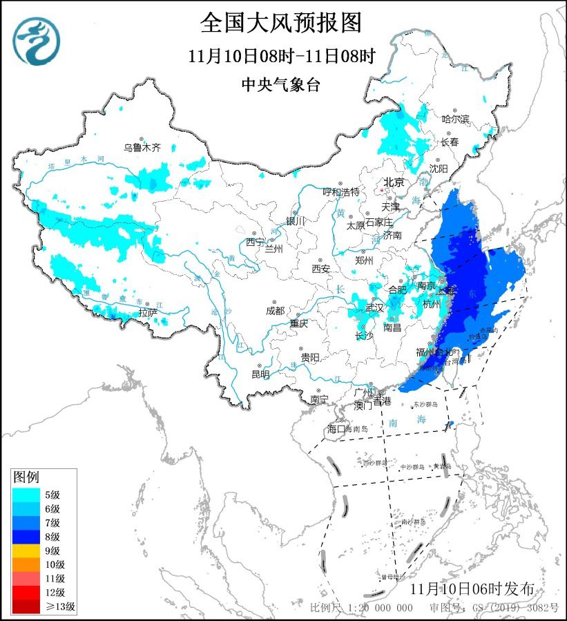 預計,11月10日08時至11日08時,內(nèi)蒙古中東部、遼寧西部、安徽中南部、河南南部、江蘇南部、上海、湖北南部、湖南東北部、江西北部、浙江北部及東部沿海、福建沿海、臺灣島沿海等地有5~6級、陣風7~8級的大風;黃海大部海域、東海大部海域、臺灣海峽、臺灣以東洋面偏北海域、南海東北部偏北海域?qū)⒂?~8級、陣風9~10級的大風。