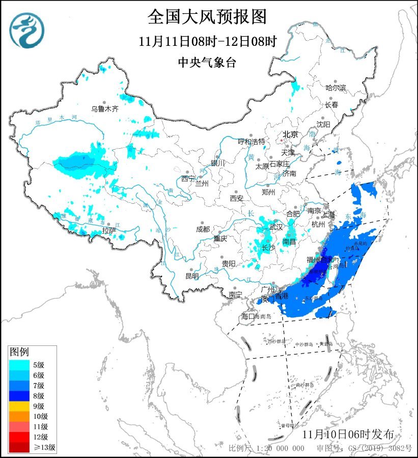 11月11日08時至12日08時,安徽南部、湖北中東部、湖南大部、江西中北部、廣西東北部以及福建沿海、廣東東部沿海、臺灣島沿海等地有5~6級、陣風7~8級的大風;東海大部海域、臺灣海峽、臺灣以東洋面、南海北部海域、巴士海峽偏北海域?qū)⒂?~8級、陣風9~10級的大風。