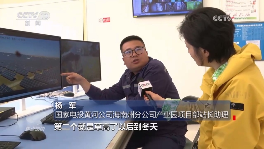 國家電投黃河公司海南州分公司產(chǎn)業(yè)園項(xiàng)目部站長助理?xiàng)钴姡骸肮夥逑旅孢@些羊,就是我們請過來幫忙除草的。因?yàn)槊磕暌坏较奶?,園區(qū)電池組件下面草就特別高,長高了以后會遮擋電池組件,一個是影響發(fā)電效率,再一個秋冬季有火災(zāi)隱患?!?/p>