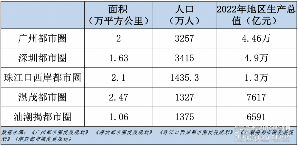 “都市圈是開放的‘圈’,是市場(chǎng)聯(lián)系和社會(huì)分工更密集的概念?!标慀櫽钕蛴浾弑硎?,都市圈的提出是為了協(xié)調(diào)城鄉(xiāng)發(fā)展,通過(guò)動(dòng)態(tài)調(diào)整規(guī)劃不斷增強(qiáng)都市圈新內(nèi)涵,將釋放廣東省區(qū)域經(jīng)濟(jì)發(fā)展的新質(zhì)生產(chǎn)力。據(jù)公開數(shù)據(jù)顯示,2022年,廣州都市圈地區(qū)生產(chǎn)總值4.46萬(wàn)億元,深圳都市圈4.9萬(wàn)億元,珠江口西岸都市圈1.3萬(wàn)億元,汕潮揭都市圈7617億元,湛茂都市圈6591億元,合計(jì)12.08萬(wàn)億元。