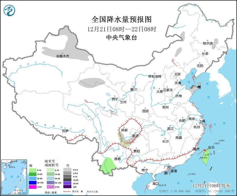 12月21日08時至22日08時,新疆北部、甘肅河西、黃淮東部等地部分地區(qū)有小雪或雨夾雪,其中,山東半島等地部分地區(qū)有中到大雪,局地暴雪(10~15毫米)。云南西南部和中部、臺灣島等地部分地區(qū)有小雨。內(nèi)蒙古東南部、青海北部、江蘇中部、川西高原北部等地部分地區(qū)有4~6級風(fēng)(見圖3)。
