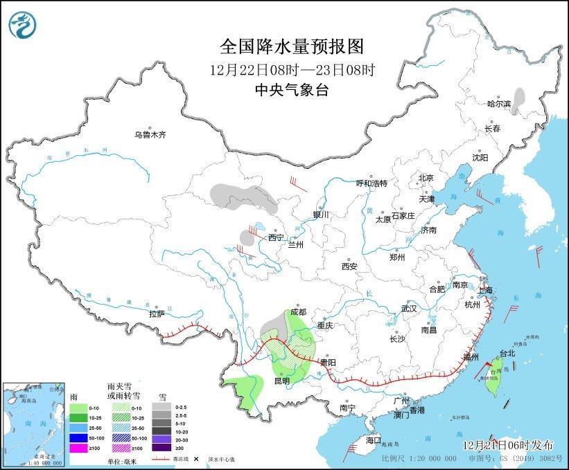 12月22日08時至23日08時,山東半島、青海北部和東部、甘肅河西、四川南部、貴州西北部、云南東北部等地部分地區(qū)有小雪或雨夾雪,其中,山東半島北部等地部分地區(qū)有中雪。四川盆地南部、云南西南部和中部、臺灣島大部等地部分地區(qū)有小雨。內(nèi)蒙古西部、青海東部和南部等地部分地區(qū)有5~7級風(fēng)(見圖4)。