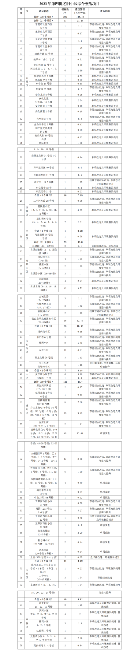 今年北京市第四批老舊小區(qū)綜合整治項目涉及東城、西城、豐臺、石景山、門頭溝、大興、房山、通州、平谷9個區(qū),各項目改造內(nèi)容根據(jù)小區(qū)居民改造意愿確定,主要包括危舊樓改建、抗震節(jié)能綜合改造、節(jié)能綜合改造、單項改造及環(huán)境整治提升等方面。