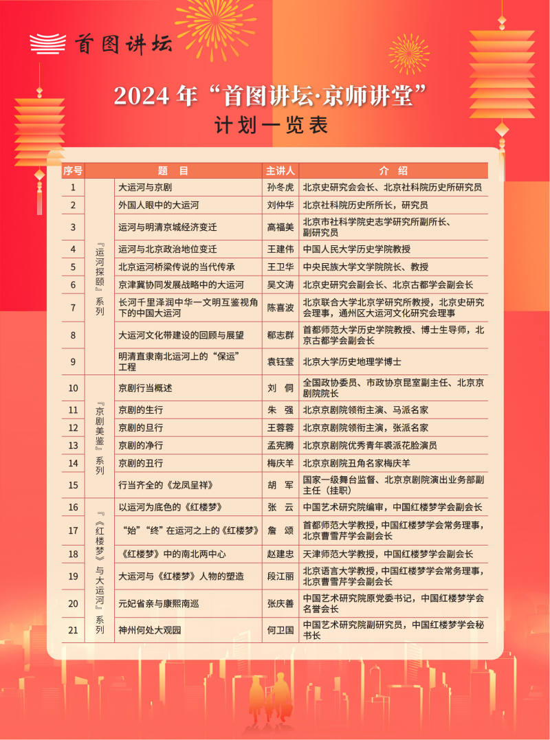 北京史研究會(huì)會(huì)長(zhǎng)孫冬虎發(fā)布“京師講堂”2024年度主題講座計(jì)劃。全年近50場(chǎng)講座,包括北京胡同四合院、三山五園、明清北京商業(yè)、龍年說(shuō)龍等歷史文化與社會(huì)生活主題,還有四項(xiàng)專題系列講座——“運(yùn)河探頤”系列將以大運(yùn)河的歷史變遷與運(yùn)河文化的挖掘、研究、傳承為焦點(diǎn),展示北京城市發(fā)展與大運(yùn)河的密切關(guān)系;“京劇美鑒”系列致力于讓聽(tīng)眾體味京劇國(guó)粹的獨(dú)特風(fēng)韻與文化價(jià)值;“《紅樓夢(mèng)》與大運(yùn)河”系列將挖掘《紅樓夢(mèng)》與世界文化遺產(chǎn)大運(yùn)河之間的密切關(guān)聯(lián);“清朝宮廷”系列將還原清代宮廷生活的真實(shí)場(chǎng)景,提升聽(tīng)眾關(guān)于清代歷史與文化的準(zhǔn)確認(rèn)知。