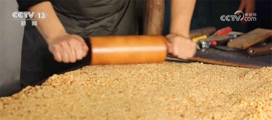 在郎溪縣姚村鎮(zhèn)一家糕餅坊,郎溪縣非物質(zhì)文化遺產(chǎn)“手工制糖技藝”傳承人陳浩武正在炒制花生芝麻米糖。他站在大鍋灶前不停地?cái)噭?dòng)著已經(jīng)加熱的糖漿,等到糖漿變得黏稠,再將糙米、花生和芝麻倒進(jìn)鍋里,不停地翻炒、攪拌,直到混合均勻。隨后,把炒好的米糖平鋪到模具中,再用搟面杖反復(fù)碾壓,讓米糖更加緊實(shí)。