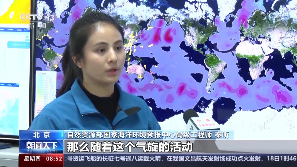 自然資源部國家海洋環(huán)境預(yù)報中心高級工程師 秦聽:那么隨著這個氣旋的活動,就會造成這種南半球的中低緯度的暖濕氣流,與南極的冷氣團之間的碰撞,所形成的這種極地的降雪,以及海霧這種低能見度的一個情況,并且會引起它作業(yè)海區(qū)的一個大風、海浪的這種高海況天氣。