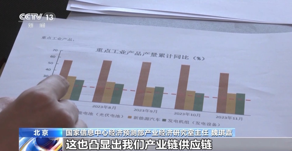 國家信息中心經(jīng)濟預測部產(chǎn)業(yè)經(jīng)濟研究室主任 魏琪嘉:像這樣的產(chǎn)品實現(xiàn)了兩位數(shù)的增長的這種態(tài)勢,其實對于一個經(jīng)濟體來講是實屬不易的。這也凸顯出我們產(chǎn)業(yè)鏈供應鏈配套能力的大幅提升。產(chǎn)品背后蘊含的是技術(shù)、要素的優(yōu)化組合,催生出新的生產(chǎn)能力,其實也是我們經(jīng)濟發(fā)展中的這種亮點。
