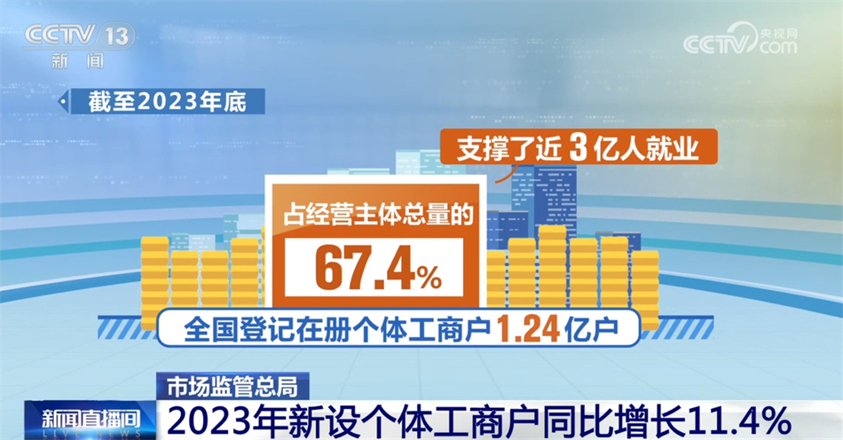截至2023年底,全國登記在冊個體工商戶1.24億戶,占經(jīng)營主體總量的67.4%,支撐了近3億人就業(yè);全年新設(shè)個體工商戶2258.2萬戶,同比增長11.4%。