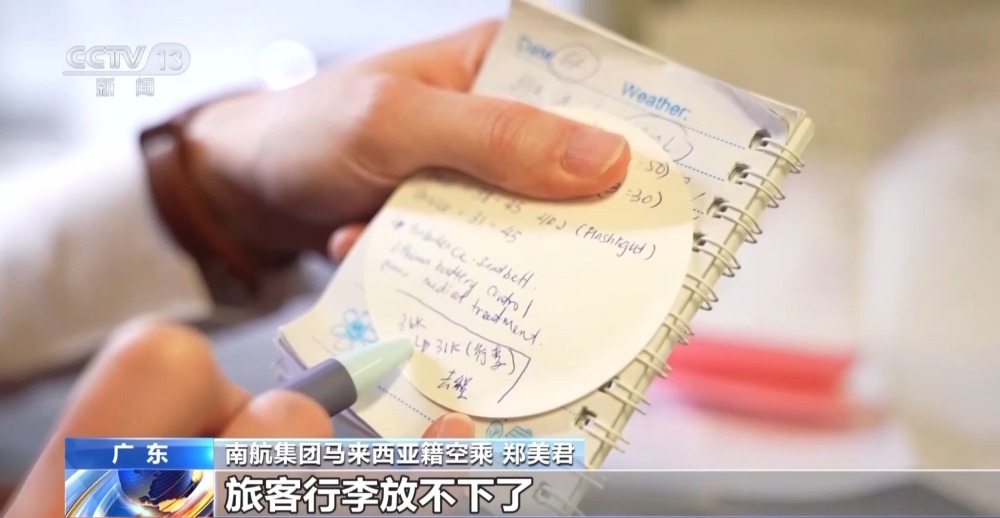 南航集團(tuán)馬來西亞籍空乘 鄭美君:有一位旅客坐在36排K,行李后面放不下了,我就給他移到前面,我又擔(dān)心自己會忘記,所以我一放下就直接把它記下來。