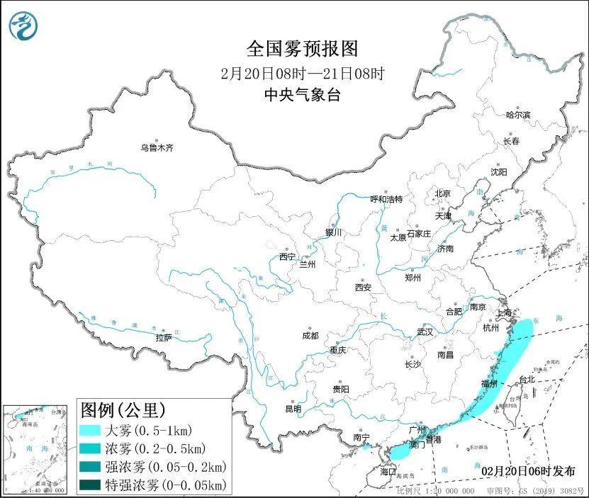 預計,20日白天至夜間,東海西部海域、浙閩沿岸海域、臺灣海峽、廣東沿岸海域、廣西沿岸海域將有大霧,能見度不足1公里。此外,20日早晨至上午,浙江東南部、廣東東南部等地將有大霧天氣,局地有能見度不足500米的濃霧。