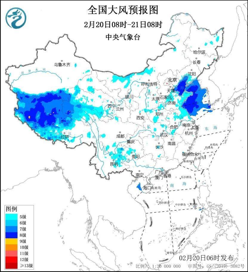 預計,2月20日8時至21日8時,西藏中西部、青海中南部、內蒙古中西部、遼寧南部、華北東南部、黃淮西部和東部、江淮西部和北部等地的部分地區(qū)有5至7級風,陣風8至9級。渤海、渤海海峽、黃海大部海域將有7至8級,陣風9至10級的大風。