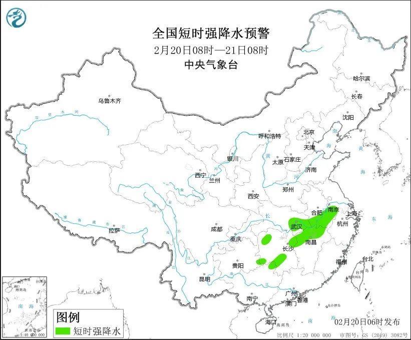 預計2月20日8時至21日8時,安徽西南部、湖北東部和南部、湖南中北部和西南部、江西中北部、貴州東南部、廣西東北部等地的局地將有8至10級雷暴大風或冰雹天氣;安徽中南部、江蘇西南部、湖北東部、湖南南部和西部、江西北部、廣西東北部等地的部分地區(qū)將有短時強降水天氣,最大小時雨量20至30毫米,局地可達35毫米以上。