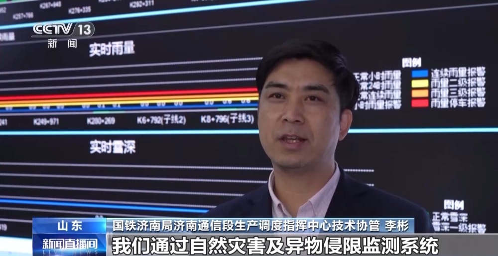 國鐵濟南局濟南通信段生產調度指揮中心技術協(xié)管 李彬:我們通過自然災害及異物侵限監(jiān)測系統(tǒng),對轄區(qū)內6000多公里鐵路線路、天氣、路況進行分析。當監(jiān)測點每小時降水量超過20毫米或瞬時風力達到15米每秒、累計雪深超過50毫米時,系統(tǒng)會自動發(fā)出告警信息,指導列車限速、降速運行。