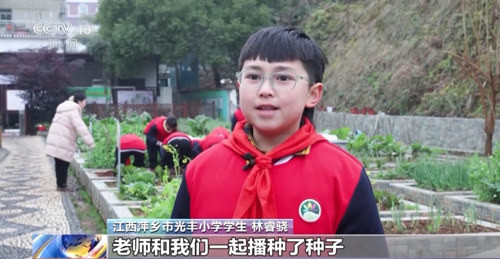 在江西萍鄉(xiāng),光豐小學(xué)的老師將新學(xué)期的第一課放到了室外,孩子們來到菜園實地觀察各種農(nóng)作物,將手中的蔬菜種子播撒在土地里,親身體驗勞動的過程。