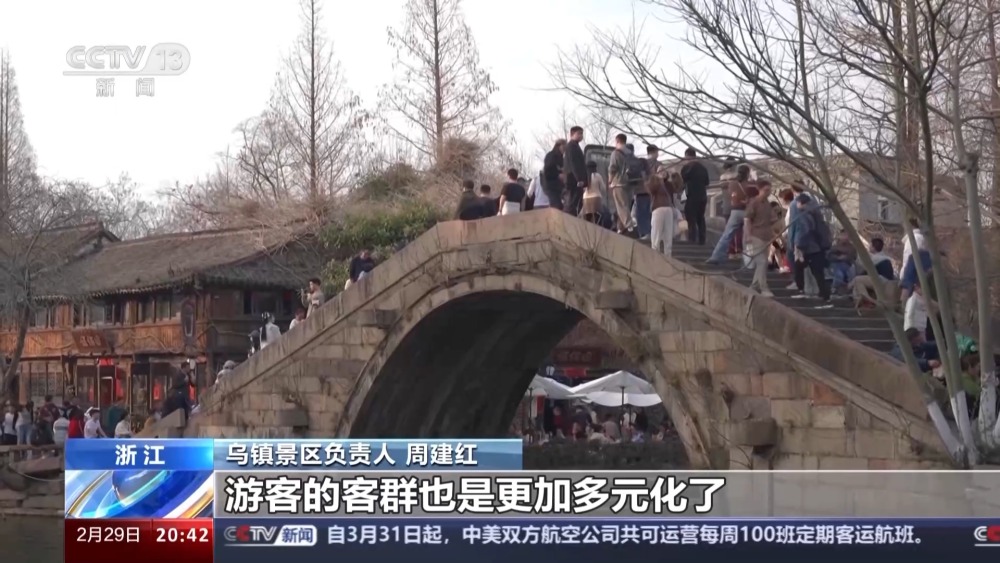 烏鎮(zhèn)景區(qū)負(fù)責(zé)人 周建紅:二月份來看,我們整個線上營銷比例已經(jīng)超過了線下,占比達到了60%,旅游產(chǎn)品也是在做不斷的一個迭代,游客的客群也是更加多元化了。十年前的春節(jié),游客量在20多萬,那這一次的春節(jié)的話,我們已經(jīng)是突破了50萬人次,也是翻倍的一個增長。