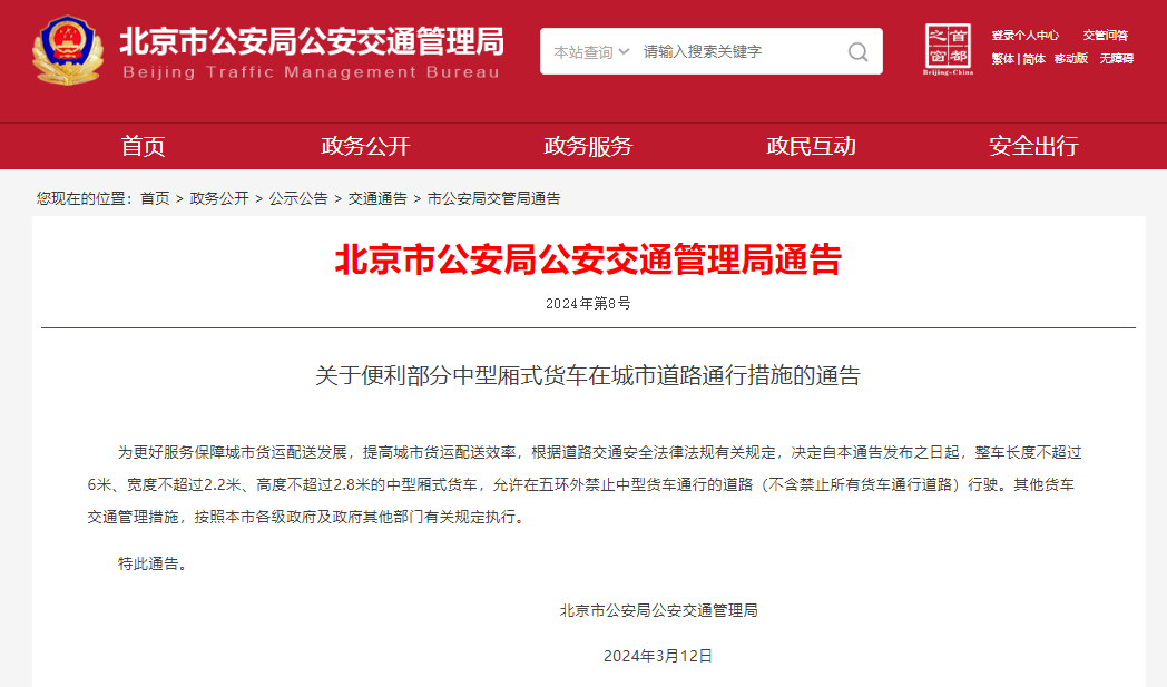 為更好服務(wù)保障城市貨運(yùn)配送發(fā)展,提高城市貨運(yùn)配送效率,根據(jù)道路交通安全法律法規(guī)有關(guān)規(guī)定,決定自本通告發(fā)布之日起,整車長(zhǎng)度不超過(guò)6米、寬度不超過(guò)2.2米、高度不超過(guò)2.8米的中型廂式貨車,允許在五環(huán)外禁止中型貨車通行的道路(不含禁止所有貨車通行道路)行駛。其他貨車交通管理措施,按照本市各級(jí)政府及政府其他部門(mén)有關(guān)規(guī)定執(zhí)行。