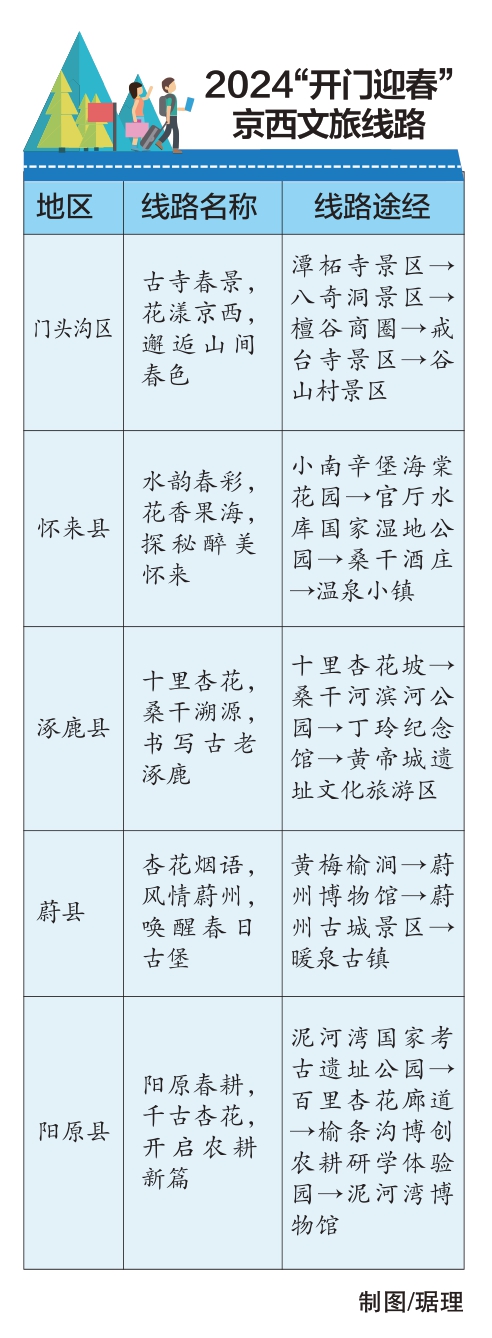 門頭溝區(qū)聯(lián)動河北省張家口市懷來縣、涿鹿縣、蔚縣、陽原縣共同發(fā)布“詩畫京西春暉行”五條春游線路,圍繞踏青、賞花、徒步、騎行、露營、微度假等元素展開,為促進京津冀消費和北京一季度“開門紅”提供助力。