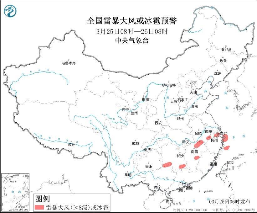 預(yù)計(jì)3月25日08時(shí)至26日08時(shí),安徽南部、湖南南部、江西中北部、浙江北部、廣西東北部等地的部分地區(qū)將有8—10級(jí)雷暴大風(fēng)或冰雹天氣;安徽南部、江蘇南部、上海西南部、湖南南部、江西、浙江中北部和東南部、福建西北部、廣西東北部等地的部分地區(qū)將有短時(shí)強(qiáng)降水天氣,最大小時(shí)雨量20-40毫米,局地可達(dá)50毫米以上。