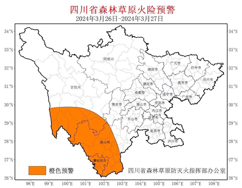 經(jīng)四川省森防指辦公室與四川省林草局、四川氣象局及相關(guān)地區(qū)會商,預(yù)計(jì)3月26日至27日攀枝花市,甘孜州東部局地和南部,涼山州西部、中部和南部(涉及21個縣級行政單位)森林草原火險等級將維持在高度危險級別。經(jīng)研究,延長省森防指辦公室3月21日發(fā)布的高森林草原火險橙色預(yù)警至3月27日,預(yù)警范圍不變。