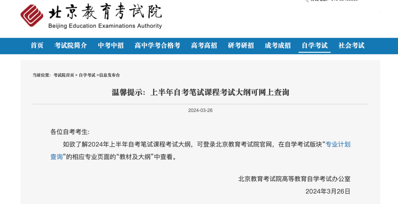 央廣網(wǎng)北京3月27日消息(記者 吳佳怡)據(jù)悉,2024年上半年自考筆試課程考試大綱可網(wǎng)上查詢。考生可登錄北京教育考試院官網(wǎng),在自學考試版塊“專業(yè)計劃查詢”的相應專業(yè)頁面的“教材及大綱”中查看。